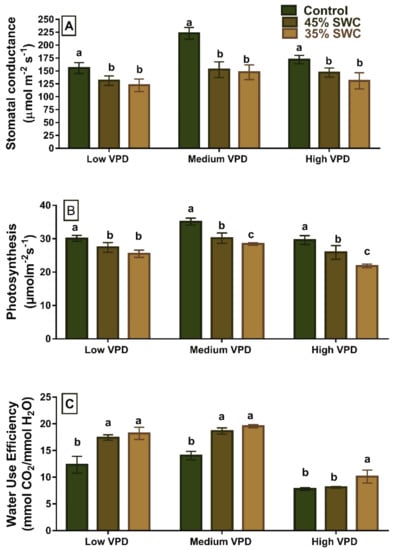 Figure 2. Gas exchange parameters (A) stomatal conductance (µmol m−2 s−1), (B) photosynthesis (µmol m−2 s−1), and (C) water use efficiency (mmol CO2/mmol H2O) of maize to different soil water content (SWC) well-watered, 45% SWC, and 35% SWC under low, medium and high vapor pressure deficit (VPD) conditions. The bars (Average ± S.E.) at each VPD represented with the same alphabet were not significantly different from each other at p < 0.05.