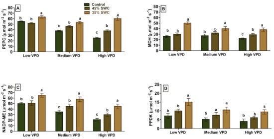 Figure 3. Enzymatic activity levels of four different enzymes (A) PEPC (B) MDH, (C) NADP-ME, and (D) PPDK (µmol m−2 s−1) in response to water limited stress (45% and 35% soil water content SWC) and evaporative demand (low, medium, and high vapor pressure deficit (VPD)). Bars (Average ± S.E.) represented with the same alphabet means the values were not significantly different at p < 0.05 calculated using Tukeys-Kramer.