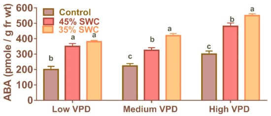 In general, the earliest response to drought is to reduce stomatal conductance to limit transpiration, which has been attributed to chemical ABA signaling playing an important role in controlling water flux in plants and reducing transpiration per leaf area [20]. An increase in the foliar ABA content as the drought progressed in all VPD treatments agrees with ABA’s role in the stomatal closure under drought, which was widely observed in several other studies (Figure 4) [19,20]. The potential ABA-producing tissues are located at various points along the continuum of soil–plant–atmosphere, and are therefore differentially sensitive to soil drought and evaporative demand [19,39]. Similar increases in ABA can also be observed with medium and low VPD treatments (Figure 4). However, the complexity of responses is largely determined by the stress threshold, and the effect of ABA chemical messengers, which varies across species and timescales [40]. In this study, a significant increase in the ABA at 35% SWC than 45% treatment or control demonstrated ABA involvement in the reduction in stomatal conductance and other parameters under stress conditions.