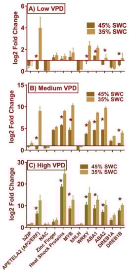 Figure 5. The relative gene expression of 12 different drought responsive transcripts measured in maize subjected to three soil water levels (well-watered, 45% soil water content (SWC), and 35% SWC) at three different vapor pressure deficit (VPD, kPa) conditions. The relative expression of 45% SWC and 35% SWC at each VPD level was calculated based on the expression in well-watered conditions. Bars (Average ± S.E.) represented with * were significantly different for 45% and 35% based on Tukey’s kramer method at each VPD level.