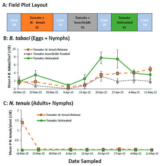 The field plot layout (A), the mean (±SE) number of B. tabaci (eggs + nymphs) per leaflet (B), and the mean (±SE) number of N. tenuis (adults + nymphs) per tomato plant (C) in a study that compared the ability of N. tenuis to control B. tabaci to insecticides (imidacloprid). The number under each field plot treatment (A) indicates the number of tomato plants.