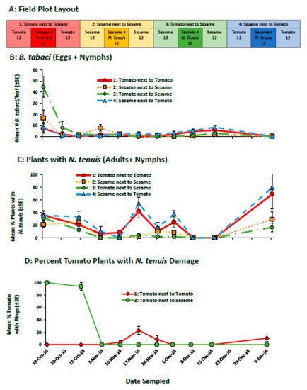 The field plot layout (A), the mean (±SE) number of B. tabaci (eggs + nymphs) per leaf (B), the mean (±SE) percentage of plants with N. tenuis (adults + nymphs) (C), and the mean (±SE) percentage of tomato plant with N. tenuis damage (necrotic rings) (D) in a study that compared the ability of sesame alone and inter-planted with tomato to retain N. tenuis and to control B. tabaci. The number under each field plot treatment (A) indicates the number of tomato and sesame plants.