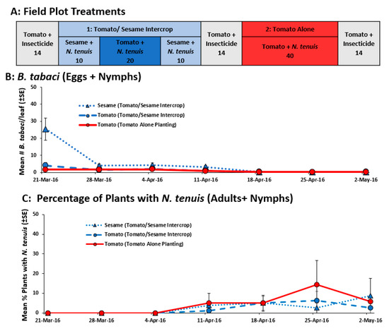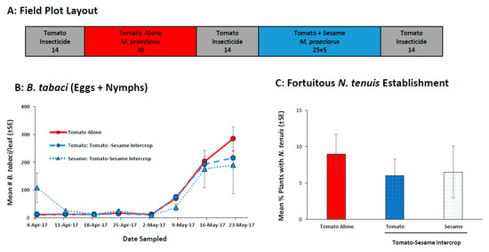 The field plot layout (A) and the mean (±SE) number of B. tabaci (eggs + nymphs) per tomato and sesame leaflet (B) in a study that tested whether a tomato-sesame intercrop retained M. praeclarus. M. praeclarus were originally released but not recovered and N. tenuis colonized from the surrounding area are reported as the mean (±SE) percentage of tomato (C) plants with N. tenuis (adults + nymphs). The number under each field plot treatment (A) indicates the number of tomato and sesame plants.