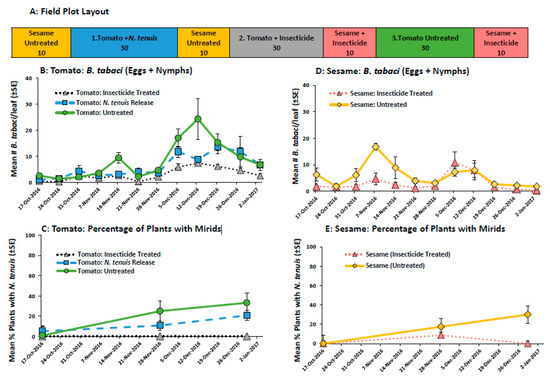 The field plot layout (A), the mean (±SE) number of B. tabaci (eggs + nymphs) per tomato (B) and sesame leaflet (C) and the mean (±SE) percentage of tomato (D) and sesame (E) plants with N. tenuis (adults + nymphs), in a study that compared insecticide-treated and N. tenuis releases to control B. tabaci. The number under each field plot treatment (A) indicates the number of tomato and sesame plants.