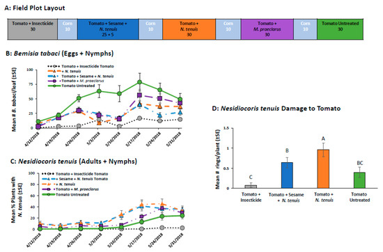 In the spring of 2018, a field study was conducted to study the ability of M. praeclarus and N. tenuis to control B. tabaci in tomato. The previous field studies showed that intercropping sesame with tomato helped retain N. tenuis, but the presence of sesame did not help to retain M. praeclarus. Therefore, tomato-sesame intercrop treatment plots were established with only N. tenuis. Each treatment plot held 30 plants (60 cm spacing) bordered by 10 corn plants (Figure 6A). There were 5 treatments (n = 5): (1) untreated tomato (grape tomatoes, var. Jolly Girl), (2) insecticide-treated tomato, (3) tomato alone + N. tenuis, (4) tomato alone + M. praeclarus or (5) tomato-sesame intercrop + N. tenuis (5 tomato plants:1 sesame plant). To establish the whiteflies in the treatment plots, tomato and sesame seedlings were placed inside 24 × 61 × 91 cm cages two weeks prior to planting in the field and infested with whiteflies by adding collard leaves taken from the colony. One week later, 1 mirid per plant was released into cages with plants designated for treatments with mirids. The seedlings were transplanted into the field on 13 March 2018. Two weeks after field planting, Verimark (90 mL/plant) was applied to the pesticide treatment plots. To suppress fungal and bacterial disease, extract of Reynoutria sachalinensis was applied to all plots on 27 March, 9 April, and 16 April 2018 at a rate of 0.95 L per 76, 151, and 227 L of water per 4047 m2 per date, respectively. The fungicide Actigard was applied to all treatments on 27 March, 9 April, and 16 April 2018 at a rate of 10 mL per 76, 151, and 227 L of water per 4047 m2 per date, respectively. Each week, B. tabaci populations were monitored by sampling 1 leaflet from the mid-canopy of 6 randomly selected plants per plot. In the laboratory, all eggs and nymphs were counted using a dissecting microscope (10×). The presence of mirids was determined weekly by counting the number of plants with at least one mirid adult or nymph per plot. At the end of the experiment, mirid feeding damage was assessed by counting the number of necrotic rings found on 5 tomato stems taken from the top one-third of the canopy of 5 randomly selected plants.