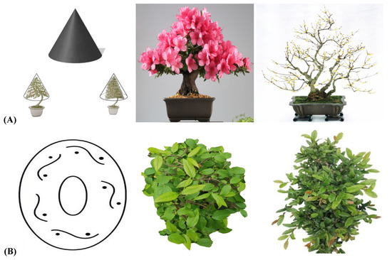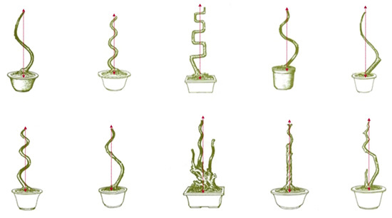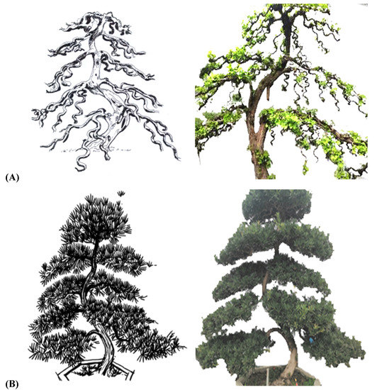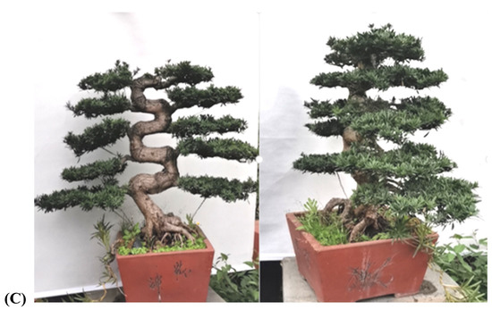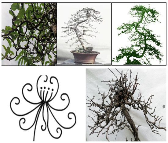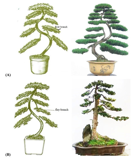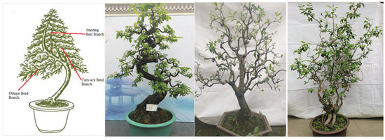 As shown in Figure 1, the traditional regular-style stump potted landscapes were characterized by a balanced tree, complete structure, elegant posture, regular form and adherence to strict rules. In the internal structure, the branches and stems were extremely tortuous and conformed to certain rules: the top and the root were nearly in a straight line and formed a central axis. All bends, whether symmetrical S bends or three-dimensional spiral bends, and the various forms of the stand-up and straight-up methods were symmetrical or rotated around the central axis, and the center of gravity of all trees was located on the centerline, which follows the general law of plant growth in nature [17,18]. Moreover, each layer of the tree crown was composed of two branches, one left and one right, which were symmetrically distributed on the left and right sides of the main trunk [18,19]. The front and rear sides of the main trunk had no branches, so the orderly relationship between the trunk and the branches was not hidden but fully revealed.