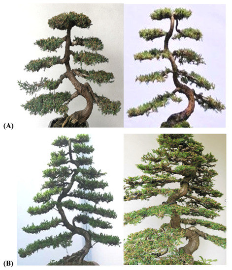 There are two types of traditional flat-branched trees in Sichuan potted landscapes: standard flat-branched and nonstandard flat-branched types. The common features of the two types are that the twisted and flat branches of the entire plant are flat and downward sloping, and the leaf tips are raised. However, there are obvious differences between the two types of branches; standard flat-branched branches have clear veins, some left branchlets that are similar to leaves, and some right branchlets that are similar to lateral veins, which are evenly distributed on both sides of the main branch, and all branches are neatly arranged [17,18]. In contrast, nonstandard flat-branched branches are relatively free, the left and right side branches are unclear, and the side branches can be on the right or left and point up or down, but, regardless, they fill in the branches to make them plump and natural (Figure 4).