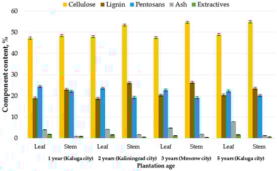 Gismatulina, Y.A.; Budaeva, V.V.; Kortusov, A.N.; Kashcheyeva, E.I.; Gladysheva, E.K.; Mironova, G.F.; Skiba, E.A.; Shavyrkina, N.A.; Korchagina, A.A.; Zolotukhin, V.N.; et al. Evaluation of Chemical Composition of Miscanthus × giganteus Raised in Different Climate Regions in Russia. Plants 2022, 11, 2791. https://doi.org/10.3390/plants11202791