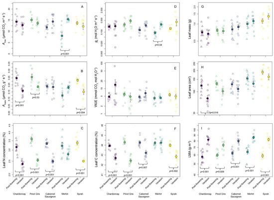 Functional trait variations across five wine grape varieties at two growth stages. Colours correspond to different wine grape varieties, with square symbols representing trait values measured post-flowering and circles representing trait values measured during veraison. Trait data are presented on log-scales where appropriate, as informed by the summary statistics presented in Table 1, and results from analyses of variance (ANOVAs), testing for differences in traits across varieties, growth stage, planting rows, and all interactions, are presented in Table 2. Additionally, certain results are presented from Tukey’s honestly significant difference (HSD) post hoc tests. For clarity, only instances where traits varied significantly within varieties across growth stages (Tukey’s HSD p < 0.05) are shown below a given contrast. Trait abbreviations are as follows: Amax: light saturated maximum photosynthetic rate on a per-unit leaf area basis (Panel A); Amass: light saturated maximum photosynthetic rate on a per-unit leaf mass basis (Panel B); leaf N: leaf nitrogen concentration (Panel C); gs: stomatal conductance (Panel D); WUE: instantaneous water use efficiency (Panel E); leaf C: leaf carbon concentration (Panel F); leaf mass: leaf dry mass (Panel G); leaf area: fresh leaf area (Panel H); LMA: leaf mass per unit area (Panel I).