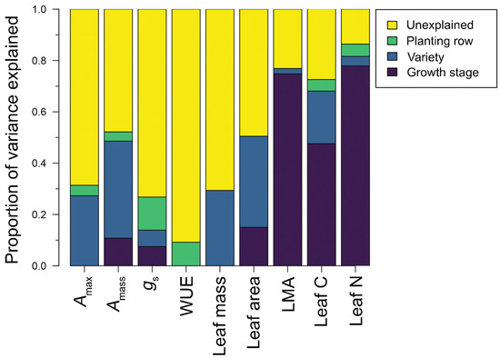 Variance partitioning of nine leaf traits measured across five common wine grape varieties, at two growth stages, and across spatial locations (i.e., planting rows). Heights of the different bar segments correspond to the proportion of total trait variation in each trait (where n = 90 leaves for all traits), as determined by a variance partitioning procedure. Variance components presented here visually correspond to the numerical values presented in Table 1. Trait abbreviations are as follows: Amax: light saturated maximum photosynthetic rate on a per-unit leaf area basis; Amass: light saturated maximum photosynthetic rate on a per-unit leaf mass basis; gs: stomatal conductance; WUE: instantaneous water use efficiency; LMA: leaf mass per unit area.