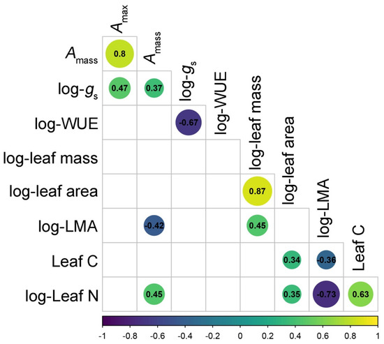 Pearson correlation tests analyzing the relationships between nine leaf traits measured across five wine grape varieties in Southern Ontario, Canada. Shades of circles correspond to Pearson correlation coefficients for each test which are presented numerically within the circles. Sample sizes for each correlation test were n = 90 leaves, and only statistically significant trait correlations represented by circles/correlation coefficients (where p ≤ 0.05) are presented here. A full trait correlation matrix is presented in Table S1. Trait abbreviations are as follows: Amax: light saturated maximum photosynthetic rate on a per-unit leaf area basis; Amass: light saturated maximum photosynthetic rate on a per-unit leaf mass basis; gs: stomatal conductance; WUE: instantaneous water use efficiency; LMA: leaf mass per unit area.