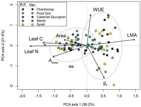 Principal components analysis (PCA) evaluating multivariate trait relationships across five wine grape varieties across two growth stages. Only seven of nine traits quantified in this study were included here, due to strong collinearity in certain traits (see Figure 3). Colours correspond to different varieties, whereas symbols represent different growth stages (post-flowering and veraison, “P.F.” and “Ver.”, respectively). To aid in visualization, also presented here are 95% confidence ellipses surrounding the two different growth stages which explained 22.9% of the variation in the seven traits analyzed here. Associated permutational analysis of variance (PerMANOVA) and relationships between individual traits and PCA axes are presented in Tables S2 and S3. Trait abbreviations are as follows: Amax: light saturated maximum photosynthetic rate on a per-unit leaf area basis; Amass: light saturated maximum photosynthetic rate on a per-unit leaf mass basis; gs: stomatal conductance; WUE: instantaneous water use efficiency; LMA: leaf mass per unit area.