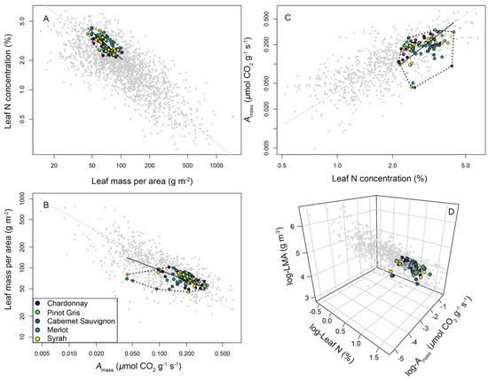 Leaf Economics Spectrum trait relationships in wine grapes. Presented here are bivariate relationships across three core LES traits including Amass, LMA, and leaf N concentrations (Panels A–C), as well as a three-dimensional representation of the relationships across the same traits (Panel D). Coloured points correspond to different grape varieties, which are not differentiated based on growth stage here to aid in visualization. Black solid trend lines correspond to the standardized major axis (SMA) regression model of a given bivariate trait relationship across wine grapes (where SMA model p < 0.05 and r2 ≥ 0.189 in all cases) and dashed black trend lines in (Panels A–C) represent convex hull models that encapsulate the two-dimensional trait space occupied by wine grape leaves. Additionally, data and SMA models for the same LES trait relationships observed among wild plants in the GLOPNET dataset are shown in all panels (grey dashed trend lines and points). SMA models were fit to the ‘Wine grape variety’ dataset, and wild plants were derived from the GLOPNET dataset (Wright et al., 2004). Full model diagnostics for each SMA model in (Panels A–C) are presented in Table S4. Trait abbreviations are as follows: Amass: light saturated maximum photosynthetic rate on a per-unit leaf mass basis; LMA: leaf mass per unit area.
