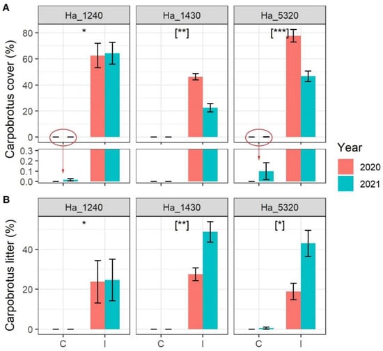 Cover of (A) Carpobrotus spp. and (B) Carpobrotus spp. dead litter in the sampled plot according to N2000 habitat, status of invasion (C = Control plots, I = Invaded plots) and year. N2000 habitat codes: 1240 = vegetated sea cliffs of the Mediterranean coasts with endemic Limonium spp., 1430 = Halo-nitrophilous scrubs (Pegano-Salsoletea) and 5320 = Low formations of Euphorbia close to cliffs. Error bars correspond to standard error. Asterisks indicate significant differences between control and invaded plots, [when in square bracket indicate significant differences within the interaction term Invasion Status:Year]. Significance codes: p value < 0.001 ‘***’; p value < 0.01 ‘**’; p value < 0.05 ‘*’. In lower panel of (A), the Carpobrotus cover scale is highly magnified to allow the reading of very small values of cover.