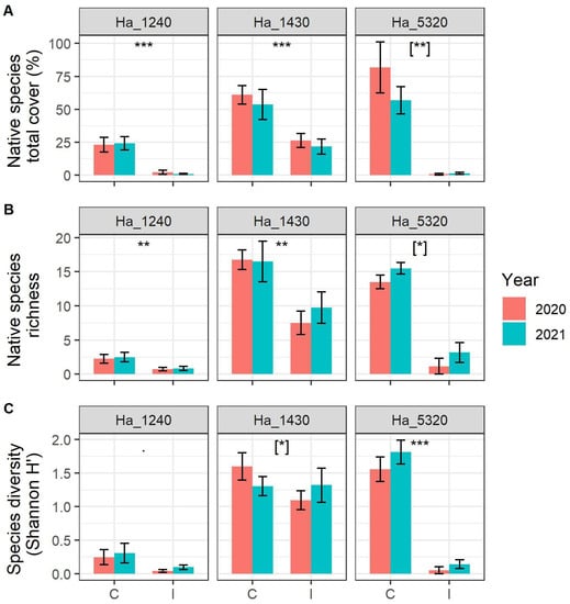(A) Native species richness, (B) native species diversity expressed as Shannon index H’ and (C) native species abundance (expressed as sum of percentage cover of each species) in the sampled plot according to N2000 habitat, status of invasion (C = Control plots, I = Invaded plots) and year. N2000 habitat codes: 1240 = vegetated sea cliffs of the Mediterranean coasts with endemic Limonium spp., 1430 = Halo-nitrophilous scrubs (Pegano-Salsoletea) and 5320 = Low formations of Euphorbia close to cliffs. Error bars correspond to standard error. Asterisks indicate significant differences between control and invaded plots, [when in square bracket indicate significant differences within the interaction term Invasion Status:Year]. Significance codes: p value < 0.001 ‘***’; p value < 0.01 ‘**’; p value < 0.05 ‘*’, p value < 0.10 ‘˙’.
