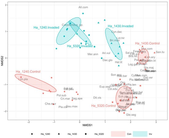 Non-metric multidimensional scaling (NMDS) ordination plot based on Bray–Curtis dissimilarities of the 88 sampled plots. Plots are grouped according to N2000 habitat and invasion status (Control plots vs. Invaded plots). Ellipses represent the standard deviation of sampled plot positions. N2000 habitat codes: Ha_1240 (circles) = vegetated sea cliffs of the Mediterranean coasts with endemic Limonium spp.; Ha_1430 (triangles) = Halo-nitrophilous scrubs (Pegano-Salsoletea) and Ha_5320 (squares) = Low formations of Euphorbia close to cliffs. See Supplementary Table S4 for plant full names. Invasion Status codes: Con (red)= Control plots; Inv (blue) = Invaded plots.