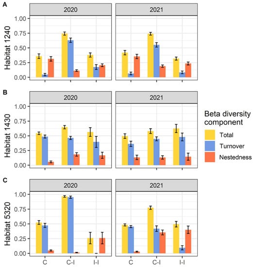 Total beta diversity and Turnover and Nestedness components in (A) habitat 1240 = vegetated sea cliffs of the Mediterranean coasts with endemic Limonium spp., (B) habitat 1430 = Halo-nitrophilous scrubs (Pegano-Salsoletea) and (C) habitat 5320 = Low formations of Euphorbia close to cliffs. Beta diversity components are separated per pairwise comparison (C = Control plots, I = Invaded plots) and year. Error bars correspond to standard error.