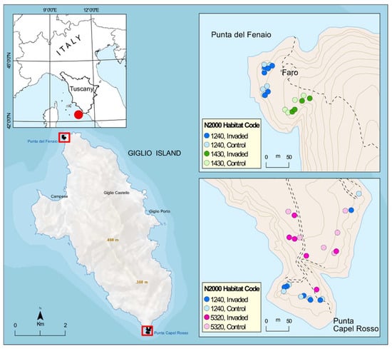 The rocky cliffs coastal vegetation of the island is of particular interest for this study, being the one invaded by Carpobrotus spp. and hosts a mosaic of habitats of conservation interest according to Directive 92/43/EEC “Habitat” including the habitat of vegetated sea cliffs of the Mediterranean coasts with endemic Limonium spp. (habitat code 1240 according to Dir. 92/43/EEC, and including the important endemic Limonium sommerianum Fiori, see also [55], the habitat of Halo-nitrophilous scrubs (Pegano-Salsoletea) (habitat code 1430, represented at Giglio Island by the subtypes identified with the alliance Artemision arborescentis) and the habitat of Low formations of Euphorbia close to cliffs (hab. code 5320). Particularly, monitoring has been carried out in coastal vegetation at two specific sites strongly invaded by Carpobrotus spp.: the promontory of “Punta Capel Rosso” (the island’s southern tip, where Carpobrotus spp. is invading two main types of habitats: 1240 and 5320) and the promontory of “Punta del Fenaio” (the island’s northern tip, where Carpobrotus spp. is invading two main types of habitats: 1240 and 1430).