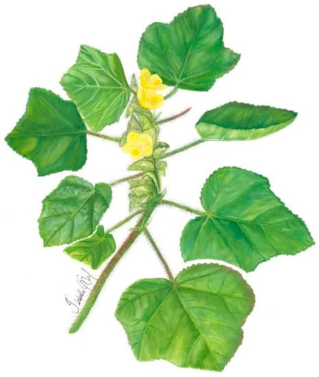 Malachra urens Poit. ex Ledeb. & Alderstam is an annual herb, up to 1 m high, with pubescent stems of different sizes and green to orange coloration. The leaves are simple, opposite and lobed, with up to three lobes relatively marked, with pubescence; the margins of the leaves are toothed, about 3–12 cm long. Inflorescences are peduncular racemes with acuminate, boat-shaped, pubescent bracts. Flowers have five petals, 2 to 3 cm in long, with a yellow color. Schizocarpic fruits have mericarps and pubescent bracts, with numerous seeds, up to 2 mm in long, dark colored, and flat (Figure 7) [48,49].