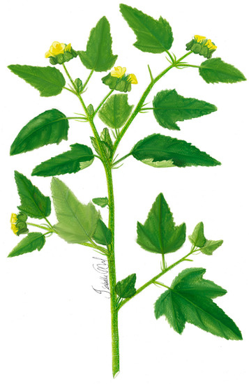 Malachra ruderalis Gürke. is an annual herb, up to 3 m high, with stem pubescence and green coloration. The leaves are simple, opposite, palmate or lobed, with up to five lobes; the texture of the leaves is velvety, and their margins are crenulate; the most apical leaves have a triangular shape. It shows pedicular inflorescence with terminal or acute axillary bracts, five petals, 3 cm long, with yellow schizocarpic fruit with numerous dark-colored seeds up to 2 mm in diameter (Figure 5) [48,49].