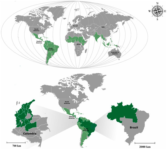 Geographical distribution of the genus Malachra L. Colombia and Brazil (green) countries with greater diversityThe countries of Colombia and Brazil have the largest number of species of the genus Malachra L., with six of the nine accepted names (Malachra alceifolia Jacq.; Malachra capitata (L.) L.; Malachra fasciata Jacq.; Malachra radiata (L.) L.; Malachra ruderalis Gürke Benth., with the different species Malachra rudis Benth. present only in Colombia [50] and the species Malachra helodes Mart. present only in Brazil [43]), followed by Peru, Ecuador, and Puerto Rico with five of the nine accepted names, see Table 3 [49,50].