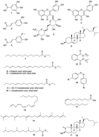 Gallic acid (GA) is a phenolic compound with anti-inflammatory, antimicrobial, hepatoprotective, neuroprotective, and carcinogenic properties that prevent gastrointestinal, cardiovascular, metabolic, and neuropsychological diseases [62]. The livers of Wistar rats exposed to carbon tetrachloride in doses of 50 mg/kg and 100 mg/kg GA, were evaluated by decreasing serum liver enzymes, regulating the expression of proinflammatory genes, and regulating the expression of antioxidant genes [63]; mercuric chloride induced at 200 mg/kg, increased glutathione peroxidase, superoxide dismutase, and catalase activity, and decreased the level of glutathione in liver tissue [64]. Caffeic acid has antimicrobial potential against Staphylococcus aureus strains with MICs from 256 µg/mL to 1024 µg/mL [65]. The compound quercetin isolated from extracts and organic fractions of Allium cepa L., Morus alba, Camellia sinensis, Moringa oleifera, and Centella asiatica, at doses between 50 and 100 mg/kg, and evaluated in in vivo models, showed antiulcer activity [66]. Beta-sitosterol isolated chloroform extract of Corchorus capsularis L. leaves has been shown to exhibit a significant effect against trypanothione reductase Leishmania donovani promastigotes at IC50 = 17.7 ± 0.43 µg/mL [67], and the dipeptide aurantiamide acetate patent has an effect of resisting influenza virus and an inhibition effect on a cytopathic effect mediated by the influenza A virus CN106431960B, filing date: 11 November 2018, legal status: active [68].