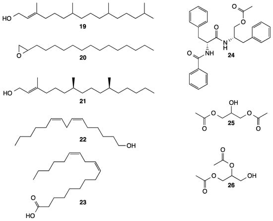- Ragasa, C.; Hofileña, J.; Co, A.; Rideout, J. Antifungal diacetylglycerols from Malachra fasciata and Pithecolobium dulce. Chem. Res. 2005, 19, 1–5. Available online: https://acquire.cqu.edu.au/articles/journal_contribution/Antifungal_diacetyglycerols_from_Malachra_fasciata_and_Pithecolobium_dulce/13398602 (accessed on 30 March 2022).