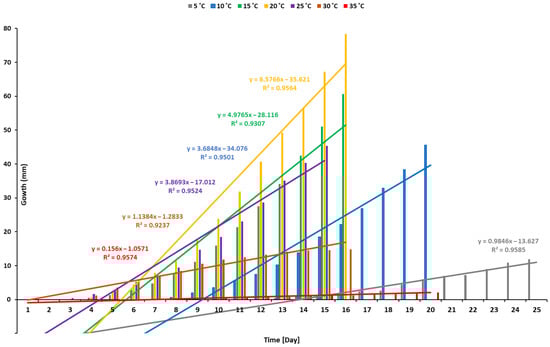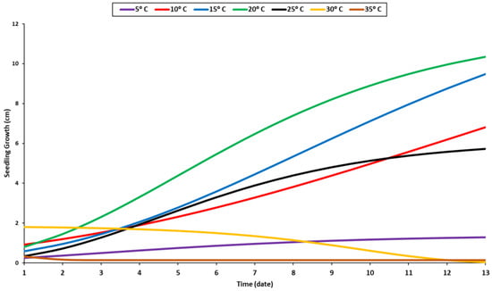 The biological effects of various temperatures, ranging from 5 °C to 35 °C, on the growth of the seedlings were recorded daily during the experimental period (Figure 4). The results indicated that the highest rate of growth occurred at 20 °C, followed by 15 °C, 10 °C, and 25 °C (Figure 4). A temperature of 20 °C was suitable for seedling growth. Similar growth patterns were observed at 10 and 25 °C, but the seeds germinated earlier under 25 °C than at 10 °C (Figure 1). At 5 °C, the seedling growth was stable but slightly inhibited, necessitating additional time for development. Additional temperature elevation beyond the optimal range was found to be detrimental to seedling growth, as evidenced by the decreased length value at 35 °C. Indeed, the seedlings grew more rapidly during the first few days at 30 °C, but their growth pattern deteriorated after a few days when they were exposed to prolonged periods of high temperatures (Figure 4).