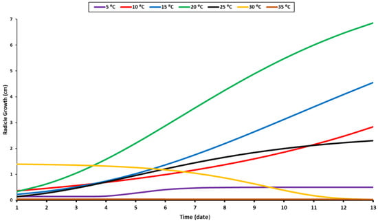 Soil temperature is a critical environmental factor affecting the growth and development of roots. When the soil temperature reaches the optimal level, root growth increases. However, root growth declines when it exceeds the optimal level [52]. At 20 °C, a rapid growth pattern with a higher growth value was observed; therefore, this was considered the optimal temperature for radicle growth. The same pattern was observed at 10 °C and 15 °C, but with lower values (Figure 2). Additional temperature elevation was detrimental to radicle growth, as evidenced by the low average value at 35 °C. At 25 °C, the radicle grew slightly for a few days before ceasing to grow and stabilizing. At 30 °C, the initial growth of the radicles was more significant compared to the subsequent decrease after a few days (Figure 2). The radicle’s sensitivity to high temperatures results from the cumulative temperature requirement for each growth stage. Surpassing the optimal temperature results in quicker germination, but this is not the case throughout the development and growth period (Figure 1). These findings corroborate previous research [39,40]. The radicle requires different cumulative temperatures throughout its growth stage. Not only does germination require a specific temperature, but each stage has its own. As a result of the complexity of the germination process, the temperature response may vary throughout the germination period [53]. In addition, as oilseed rape seeds are susceptible to damage under prolonged high temperatures, prior research has often focused on heat shock and gradual temperature rises from the ideal to a higher value [54,55]. They concluded that the alternated heat accumulation potential stimulated by gradual temperature stress might be more important than heat tolerance induced by constant or unexpected heat exposure [54]. The radicle cannot grow for an extended period of time at constant higher temperatures, a finding that is comparable to that which we observed at 30 °C (Figure 2).