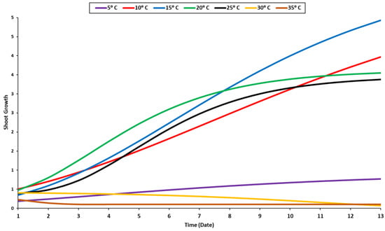 The shoot can grow in a temperature range of 10–25 °C, with a minor difference between different temperature levels (Figure 3). Compared to the radicle, the shoot grew in a different growth pattern (Figure 3). The radicle’s optimal temperature was 20 °C, while the shoot’s optimal temperature was between 15 °C and 20 °C regardless of its growth stage (Figure 3). The radicle requires a higher temperature than the shoot due to its internal organs, which grow into the soil. During the very late stage of the germination process, the steady growth of the shoot was observed at temperatures of 20 °C and 25 °C (Figure 3). The seedling growth was significantly influenced by temperature. The temperature of 20 °C was proven to be the optimum temperature for seedling development (Figure 4). Most enzymes become inactive at temperatures over 35 °C, negatively impacting germination and seedling development [56].