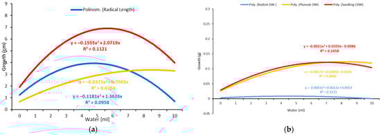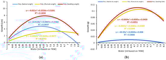 Response of seedlings, plumules, and radicles to different amounts of water at 20 °C. (a) Growth vs. water based on TKW%. (b) Dry weight accumulation vs. water based on TKW%.
