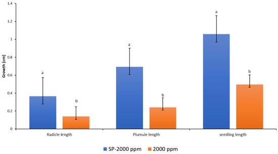 Response of radicles, plumules, and seedlings to different concentrations of antifungal. Values denoted with different letters are significantly different at p < 0.05.