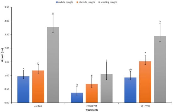 Response of the radicles, plumules, and seedlings to media amended with anti-fungicide (Amistar Xtra) and Hypo solution SP. Values denoted with different letters are significantly different at p < 0.05.