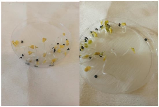 A significant difference between seedlings with healthy shoot growth subjected to the seed number treatment of 15, 20, and 25 seeds per Petri dish was found (Table 3). As the number of seeds per Petri dish increased, the subdivision of seedlings with healthy shoot growth and the aggregated values increased. Under controlled conditions, a seed density of 20–25 seeds per Petri dish is optimal for growing oilseed rape in vitro. Although the density of 15 seeds stimulated germination, the seedlings grew slower. At a low seed number, the lack of seedlings could be attributed to the scarcity of a critical resource, such as water, due to competition [63]. Additionally, dense seedlings are frequently more susceptible to lodging, which increases the rate of disease incidence and, as a result, the seedling emerging percentage [64]. Therefore, optimizing the seed number per Petri dish in germination is a critical consideration during germination, along with other environmental factors.