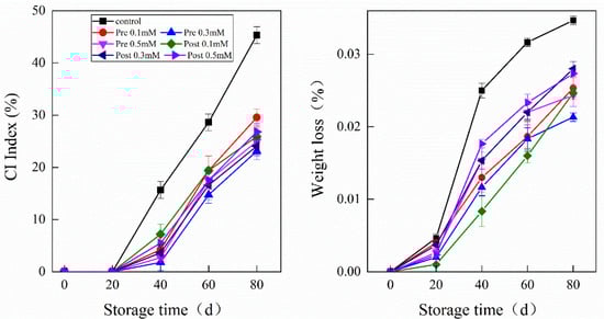 Each individual fruit was weighed on day 0 and after each sampling date during storage, and weight loss rate (WL) was expressed as a percentage (%). The texture profile analysis (TPA) was carried out following Qiu et al. (2021) [20], with modifications, using a texture profile analyzer (TMS-Pilot, Ensoul Technology Ltd., Beijing, China). Springiness, firmness, gumminess, and chewiness were recorded (Table 1). For electrolyte leakage (EL) evaluation, lemon fruits from each treatment were randomly sampled and peel samples (2 g) were placed in a 25 mL beaker with 20 mL of distilled water and shaken at room temperature for 3 h. First electrolyte leakage (EC1) and second electrolyte leakage (EC2) were measured after 3 h of shaking and after autoclave at 121◦C for 20 min and cooling down at room temperature, respectively, using a DDS- II conductometer. EL (%) = EC1/EC2×100. The CI index was calculated visually using a scale of 0–4 based on the percentage of lemon fruit surface area exhibiting pitting and/or dark watery patches as follows: 0 = no symptoms; 1 = slight injury (1–25%); 2 = moderate injury (26–50%); 3 = severe injury (51–75%); and 4 = extremely severe injury (76–100%). CI index (between 0 and 4) = Σ(CI scale) × (number of fruit at the CI level)/(total number of fruits in the treatment).