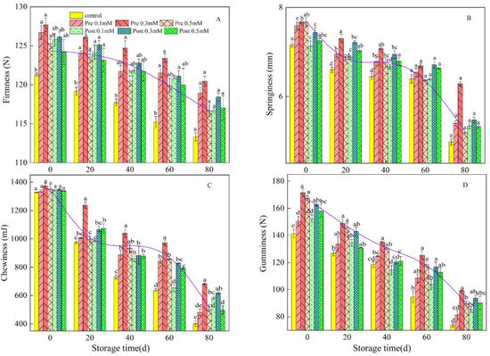 Effect of pre-harvest (Pre) and post-harvest (Post) methyl jasmonate treatments on firmness (A), springiness (B), gumminess (C), and chewiness (D) of lemons in storage at 7–10 °C. Data are the mean ± SE of three replicates of five fruit. Different lowercase letters show significant differences among treatments for each sampling date at p < 0.05 level.