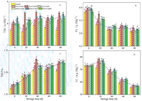 Effect of pre-harvest (Pre) and post-harvest (Post) methyl jasmonate treatments on the TSS (A), TA (B), TSS/TA ratio (C) and VC (D) in lemons in storage at 7–10 °C. Data are the mean ± SE of three replicates of five fruit. Different lowercase letters show significant differences among treatments for each sampling date at p < 0.05 level.