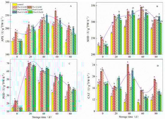 Effect of pre-harvest (Pre) and post-harvest (Post) MeJA treatments on APX (A), SOD (B), POD (C) and CAT (D) in lemons in storage at 7–10 °C. Data are the mean ± SE of three replicates of five fruit. Different lowercase letters show significant differences among treatments for each sampling date at p < 0.05 level.