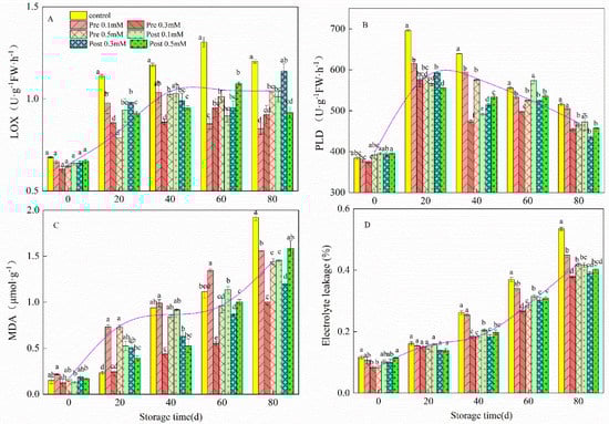 Pre- and post-harvest MeJa treatment inhibited the LOX, PLD, MDA, and electrolyte leakage (EL) of fruit at harvest and during storage (Figure 6). In this study, compared with the control lemons, LOX (Figure 6A) and PLD (Figure 6B) activities were significantly inhibited (p < 0.05) in MeJA-treated lemons. During refrigeration, the MDA content of lemon fruits increased and MeJA treatment significantly inhibited the MDA content of lemon fruits at the end of the storage period (Figure 6C). The MDA content in pre-harvest 0.3 mM MeJA-treated fruit was 47.8% lower than that in the control fruit on day 80. The EL of all the fruits increased rapidly when they were kept in cold storage, but the EL level of the control fruits was higher than that of the fruits treated with MeJA (Figure 6D). At the end of the experiment (80 d), EL in pre-harvest 0.3 mM MeJA-treated fruit was 29.11% lower than that in the control fruit, while that in the post-harvest 0.3 mM MeJA-treated fruit was 25.54% lower than that in the control fruit. Pre-harvest MeJA application was far more effective than post-harvest MeJA application in regard to EL.