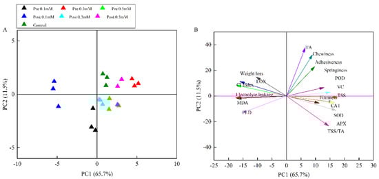 Principle component analysis (PCA) of 17 important indexes measured at the last sampling date of the lemons. (A) Score plot of PC2 against PC1; (B) Load plot of PC2 against PC1.