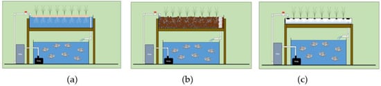 Popular aquaponics systems: (a) deep water culture (DWC), (b) ebb and flow system, (c) nutrient film technique system. These diagrams are sourced from [103].