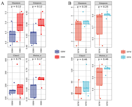 Alpha Diversity Index of the microbial communities of healthy and B. xylophilus–infected P. massoniana. (A) Endophytic bacteria. (B) Endophytic fungi. Nematode-infected Wilted pines are designated as P. massoniana. EBH, healthy pine endophytic bacteria; EBW, wilted pine endophytic bacteria; EFH, healthy pine endophytic fungi; EFW, wilted pine endophytic fungi.