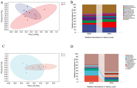 The endophytic bacteria of healthy pines (EBH), the endophytic bacteria of wilted pines (EBW), the endophytic fungal of healthy pines (EFH), and the endophytic fungal of wilted pines (EFW) were used to split the total samples (EFW). There were 178 common bacterial OTUs between the wilted (EBW) and the healthy (EBH) pines among the B. xylophilus-infected samples (Figure 3A). However, both groups possessed OTUs that were unique to them, with 476 in the healthy pines and 346 in the wilted pines, resulting in a reduction in bacterial diversity in the B. xylophilus-infected pines. Meanwhile, there were 45 common fungal OTUs between the wilted (EFW) and healthy (EFH) pines among B. xylophilus-infected samples (Figure 3C). Yet, both groups possessed OTUs that were unique to them, with 259 in the healthy pines and 136 in the wilted pines, resulting in a reduction in the fungal diversity of the B. xylophilus-infected pines.