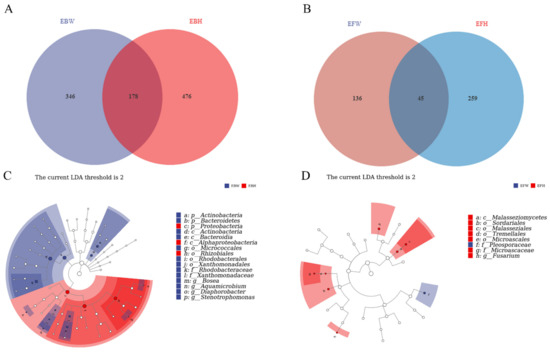 Venn diagrams of the unique and shared operational taxonomic units (OTUs) of sequenced samples and LEfSe diagrams between all the samples from healthy pines and wilted pines. (A) Bacterial data among all samples from healthy pines and wilted pines. (B) Fungal data from all the samples from healthy pines and wilted pines. (C) LEfSe analysis diagrams of bacteria data between all the samples from healthy pines and wilted pines. (D) LEfSe analysis diagrams of fungal data between all the samples from healthy pines and wilted pines.