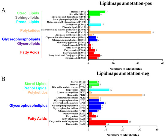 LIPID MAPS category annotation and heatmap analysis of differential metabolites of polyketides. (A) Positive ion mode, (B) Negative ion mode: the horizontal coordinate represents the number of metabolites, and the vertical coordinate represents the LIPID MAPS lipid categories annotated to; this figure shows the number of metabolites annotated to the Main_Class under the eight major lipid categories in LIPID MAPS; (C) Heatmap display of the different substances of polyketides.