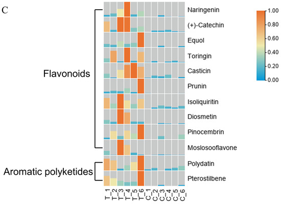 The LIPIDMaps database http://www.lipidmaps.org/ (accessed on 9 July 2021) was used to annotate the identified differential metabolites into eight major groups, namely: (1) Fatty Acids (FA); (2) Glycerolipids (GL); (3) Glycerophospholipids (GP); (4) Sphingolipids (SP); (5) Sterol Lipids (ST); (6) Pregnenol Lipids (PR); (7) Saccharolipids (SL); (8) Polyethylene (PK). The top three metabolites for the positive ion pattern differences were 31 Polyketides (PK), 12 Prenol Lipids (PR), and 23 Fatty Acids (FA) (Figure 6A). The top three metabolites for the negative ion pattern differences were 50 Polyketides (PK), 10 Prenol Lipids (PR), and 13 Sterol Lipids (ST) (Figure 6B). We mainly focused on the content changes of Polyketides (PK) class substances because, in the positive and negative ion modes, the largest number of Polyketides (PK) species was annotated, with a total of 93 species. Among them, there are 12 different substances between the treatment group and the control group. Among them, 10 Flavonoids and 2 Aromatic polyketides were significantly elevated compared to the control group (Figure 6C).