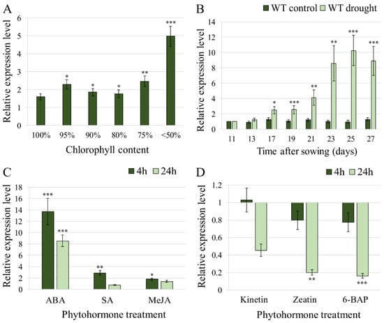 The relative transcript level of HvFP1 in the samples of the WT barley primary leaves: (A) during different stages of the developmental leaf senescence, as defined by the reduction in the chlorophyll content, compared with the samples from the 13th DAS (set as 1); (B) at different time points of drought stress, compared with the well-watered samples from the 11th DAS (set as 1); (C) after treatment with abscisic acid (ABA), salicylic acid (SA) and methyl-jasmonate (MeJA) in comparison to the control treatment without phytohormones (set as 1) and (D) after treatment with kinetin, zeatin and 6-benzylaminopurine (6-BAP), in comparison to the control treatment without phytohormones (set as 1). Mean relative expression level of the three independent biological replicates, standard errors and p-values were determined by REST-384 © 2006 (Relative Expression Software Tool-384, version 2.0, [14], Qiagen GmbH, Hilden, Germany) and normalized against HvPP2A, HvActin and HvGCN5. Statistically significant differences between (A) the WT samples at various developmental stages, compared to the WT samples from the13th DAS, (B) control and the drought WT samples, compared to the well-watered WT samples on the 11th DAS, and (C) WT samples after treatment with various phytohormones, compared to their respective controls, are indicated with asterisks: p < 0.05 (*), p < 0.01 (**), p < 0.001 (***).