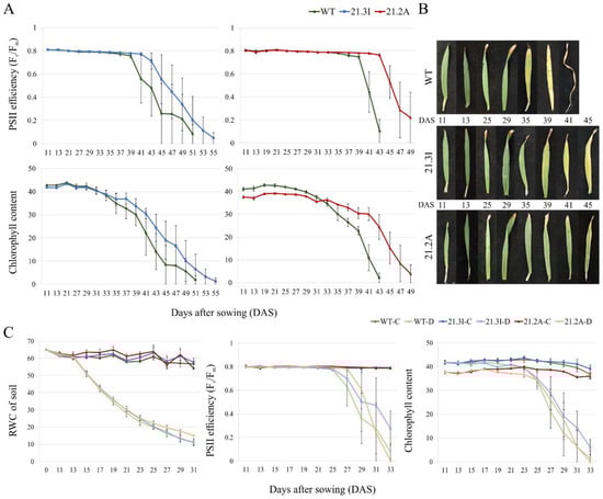 Prolonged drought stress results in the premature leaf senescence. In our experimental setup, drought stress was induced by stopping irrigation after the 11th DAS and the first time point of drought stress was considered on the 13th DAS. From that time point, the relative water content (RWC) of the soil, which was about 65% in the well-watered controls, continuously decreased, as shown in Figure 2C, reaching 30% after about 10 days and 10% after about 20 days. Under these conditions, which reflected the natural drought stress caused by aridity, a premature senescence was induced in the primary leaves. This was indicated by an early loss of the chlorophyll content, starting on the 21st DAS, and a rapid decrease in the photosynthetic performance, as indicated by a lower PSII efficiency, starting on the 25th DAS (Figure 2C). In contrast to normal senescence, the drastic drought-induced leaf senescence followed the same trend in the WT and both OE lines.
