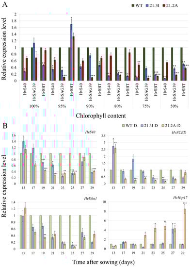 For monitoring the developmental leaf senescence, 10 germinated barley seeds of the WT or transgenic lines were sown in soil in Mitscherlich pots and were grown in greenhouse cabinets. Every two days, the Mitscherlich pots were rotated around the cabinet, in order to eliminate the effect of the location on the results. At the same time points, the changes in the physiological parameters were monitored by measuring the PSII efficiency and the chlorophyll content of 20 primary leaves, until the senescence of the primary leaves. The samples of four to five primary leaves were taken at each time point, they were frozen in liquid nitrogen and stored at −80 °C. The experiment was performed three times.