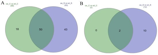 Venn diagrams of: (A) upregulated genes in the oe_C vs. wt_C and the oe_S vs. wt_S samples and (B) downregulated genes in the oe_C vs. wt_C and the oe_S vs. wt_S samples.